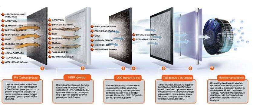 В приборе 8 степеней очистки. Фильтрацию осуществляют: НЕРА-элемент, угольный, электростатический, фотокаталитические устройства, ультрафиолетовая лампа.