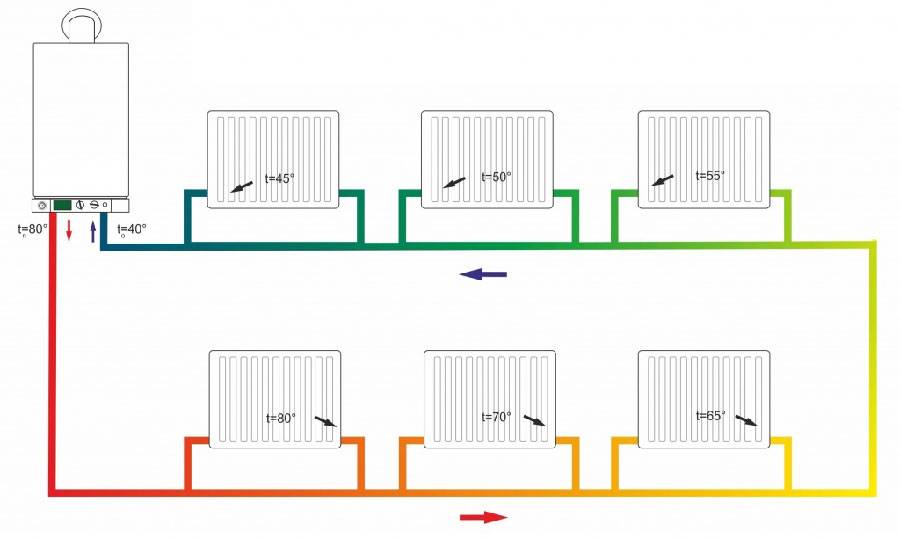 Теплоноситель охлаждается по мере передвижения по контуру. Из-за чего радиаторы, установленные далеко от котла, нагреваются меньше, чем близко расположенные. Потому рекомендовано устанавливать медленно остывающие чугунные приборы.