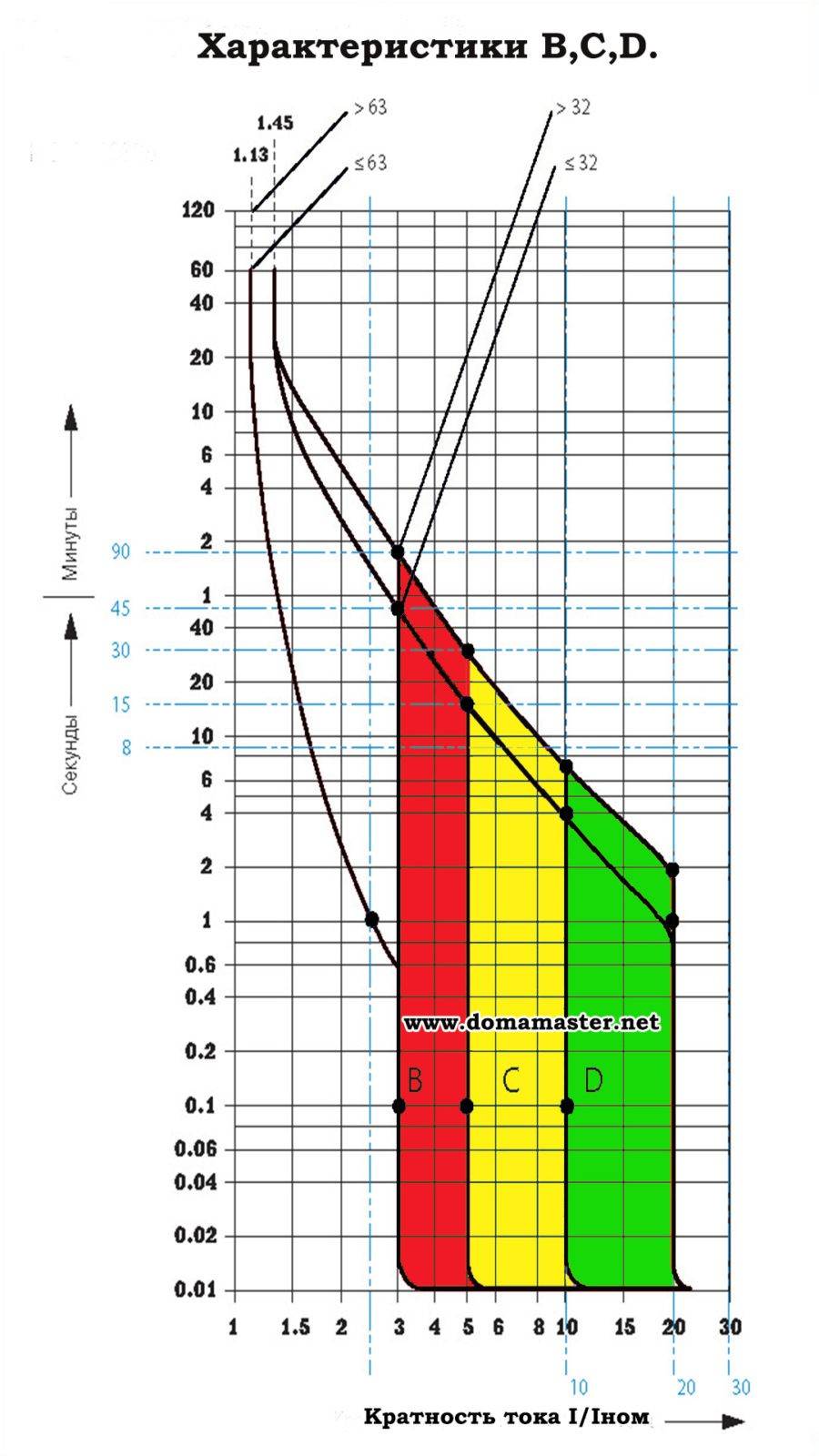 Если рассмотреть вопрос более обобщённо, то можно выделить, несколько основных характеристик: B, С, D. В свою очередь, данные характеристики определяют при какой величине тока, автомат отключится мгновенно. Параметры отключения для характеристик B, С, D: