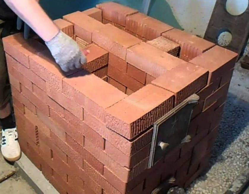 Но с этого момента необходимо начать формировать поддувальную камеру размером 200х300 мм. Обычно она располагается в левой и задней части печи.