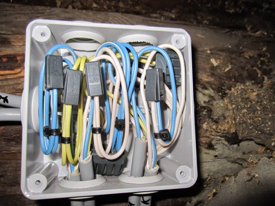 Принцип соединения проводки такой-же, а монтаж производится иначе. Сначала устанавливаются узловые коробки, затем к ним подводится наружный кабель. Поскольку защиту от попадания пыли и влаги обеспечивает корпус, кабели заводятся внутрь с помощью уплотнительных хомутов.