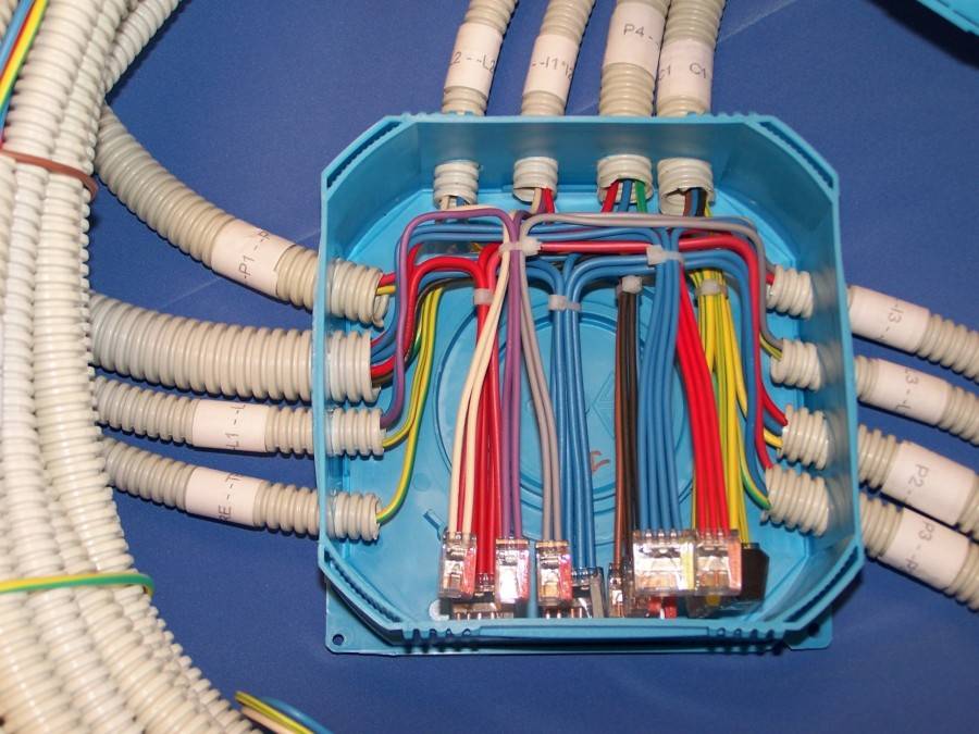 Затем происходит расключение базовой распределительной коробки на каждого потребителя в помещении. Для этого могут быть установлены дополнительные распаечные коробки.