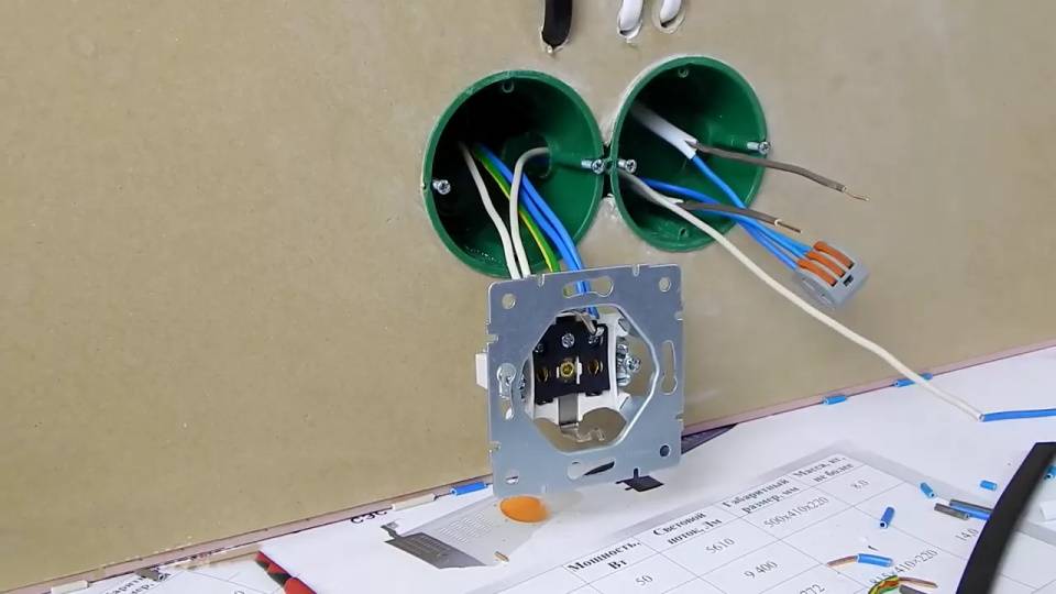 Между узловыми точками (где устанавливаются коробки), прокладывается проводка. Поскольку монтаж скрытый, для кабеля штробятся стены, коробочки устанавливаются на алебастр. Подготовленные провода выводятся из установленных коробок для расключения. Длина свободных концов должна обеспечивать возможность соединения без натяга, и запас на 2–3 переделки (с отрезанием использованных проводников).
