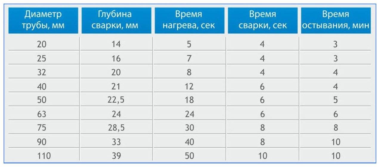 При составлении таблицы основным критерием служила определенная экспериментальным путем оптимальная температура сварки полипропиленовых труб, равная 260 °С.