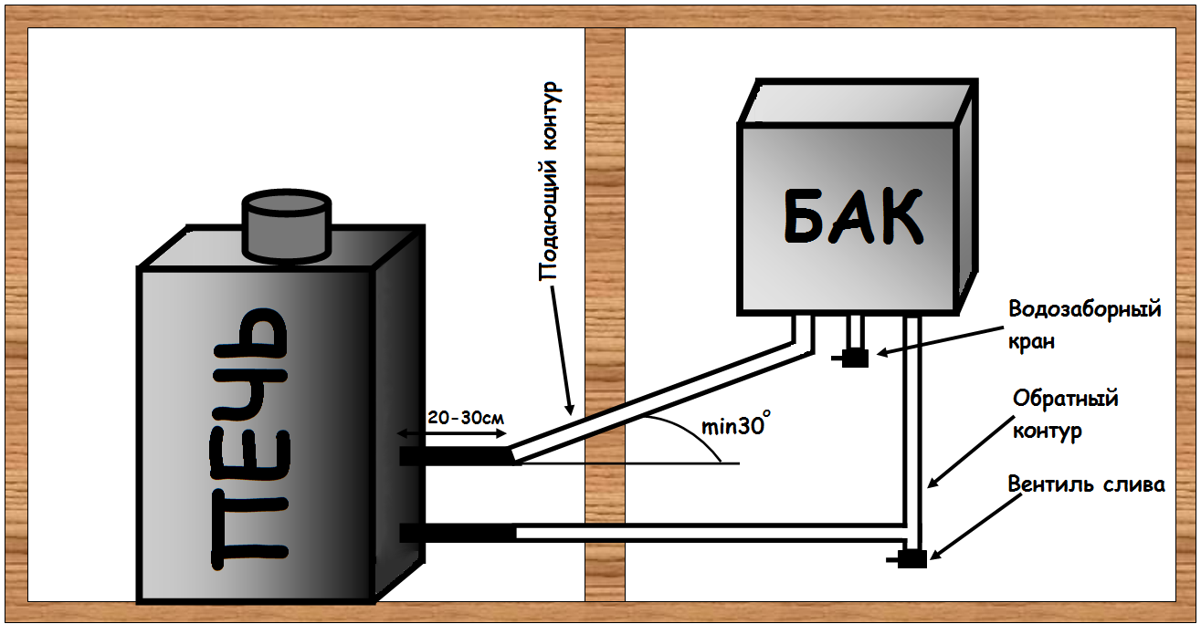 Для монтажа бака к нижней части короткой трубы приваривается круглая стальная заготовка, имеющая толщину металла не менее 9 мм. В приваренном круге проделывается отверстие диаметром 150 мм. На верхней части бака монтируется стальной полукруг. В этом элементе конструкции проделывается отверстие для дымовыводящей трубы. Открытая половина верхней части бака закрывается крышкой, имеющей полукруглую форму. Крышка закрепляется на полукруглой заготовке, которая ранее была приварена к баку для воды. После завершения монтажных работ по установке и сборке бака через подготовленные отверстия проводится труба-дымоход. В нижней части бака делается отверстие для закрепления краника, предназначенного для осуществления слива горячей воды.