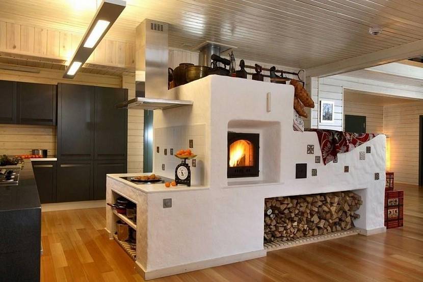 Если планировка состоит из двух комнат: общей комнаты и кухни, то разумней основную часть вынести в комнату, а варочную поверхность и топку на кухню.