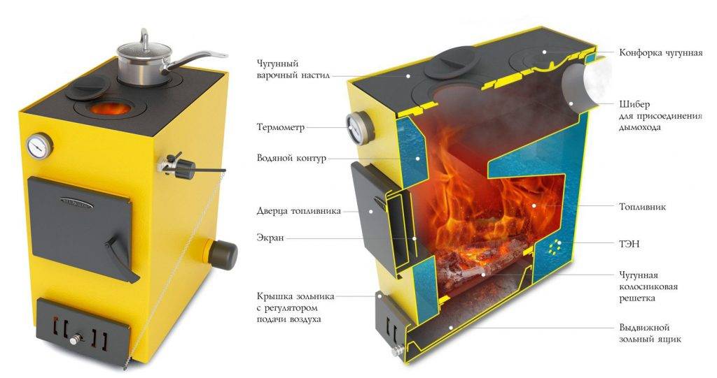 Водяные контуры, нагреваясь от топлива, подогревают установку, нагреваются дымовые каналы, стенки отопительного агрегата. К отопителю подключают батареи, которые становятся теплыми в процессе сгорания горючего в топке. Нагретый агрегат обеспечивает теплом помещение, пока стенки полностью не остынут.