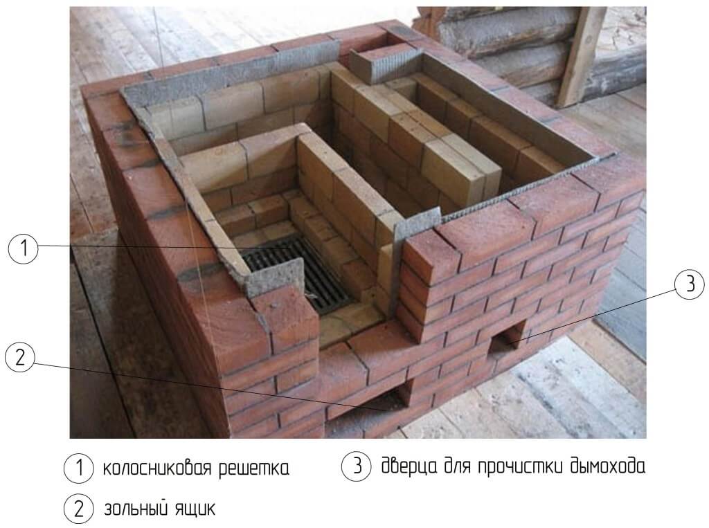 После того, как первый ряд выложен, поставьте дверцу для поддувала. Далее следуйте порядовке при кладке последующих рядов. Чтобы сформировать внутреннее пространство поддувала, топки и других внутренних элементов печи следует кирпичи немного стесать