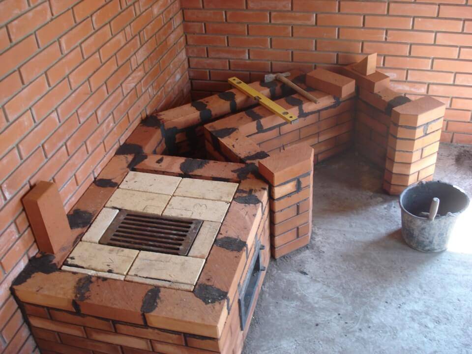 Помните, чтобы кирпичи и металл имеют разные конфигурации в плане расширения тепла, при их установке рядом соблюдайте зазор на полтора сантиметра. Заполните зазоры сухим песком, а пространство вокруг топочной камеры и саму топку заделайте шамотом. Не допускайте отклонений и перекосов на этом этапе работы, чтобы без труда на кладку можно было поставить варочную плиту из чугуна для приготовления пищи.