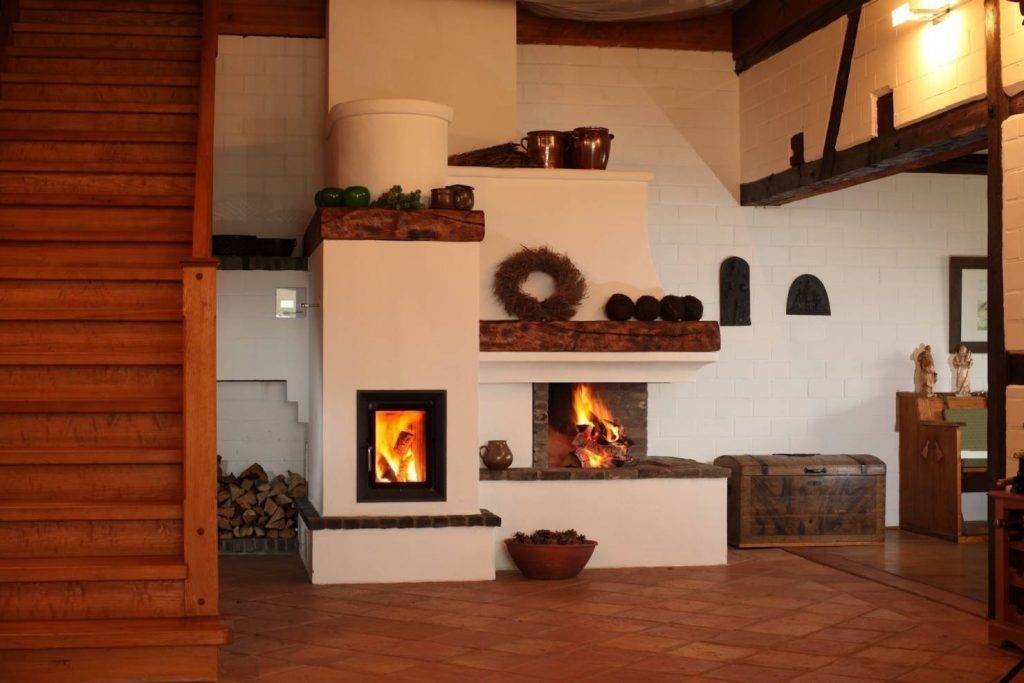 Если же необходимо обогреть весь дом, то для печи выбирается соответствующее место, где она будет обогревать сразу две комнаты, или же вариант с лежанкой, от которой исходит также достаточно большое количество тепла.