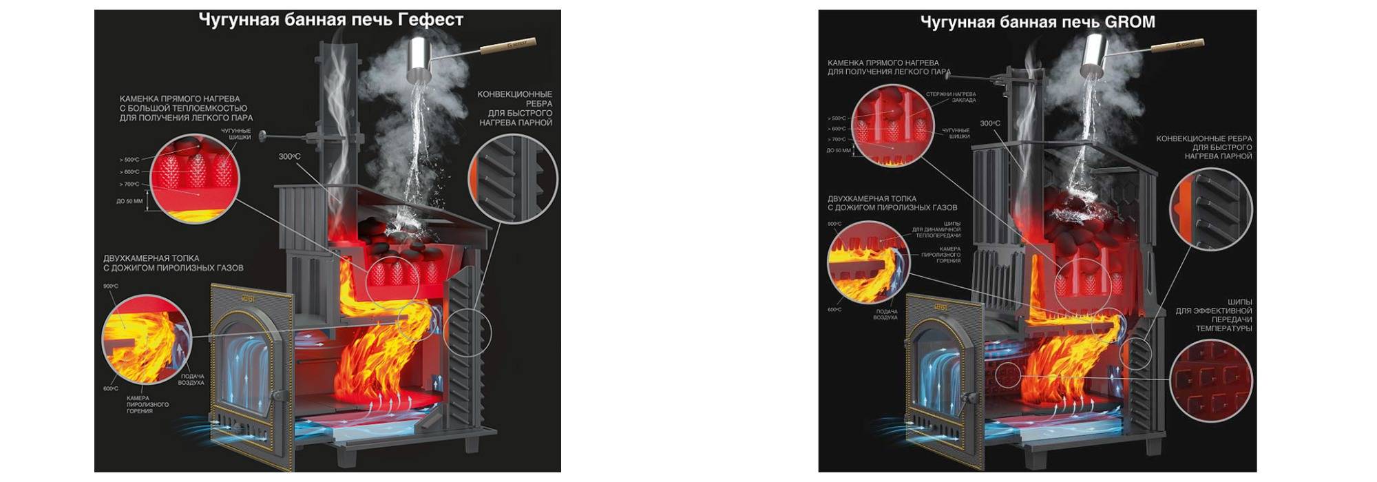 У каменок рассматриваемых печей запатентованная форма. У Гефест ЗК она глубокая, трапецеидальной формы с утолщенным дном, увеличенной массой и с литыми шипами на днище. У Грозы каменка имеет торчащие литые штыри внутри и снаружи. И хотя форма у них проще, чем у ЗК, масса позволяет генерировать достаточное количество пара.