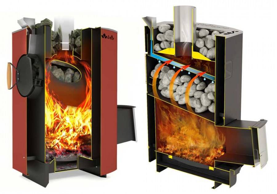 При решении учитывается используемый принцип работы: обычное и длительное горение, наличие встроенного теплообменника, тип каменки.