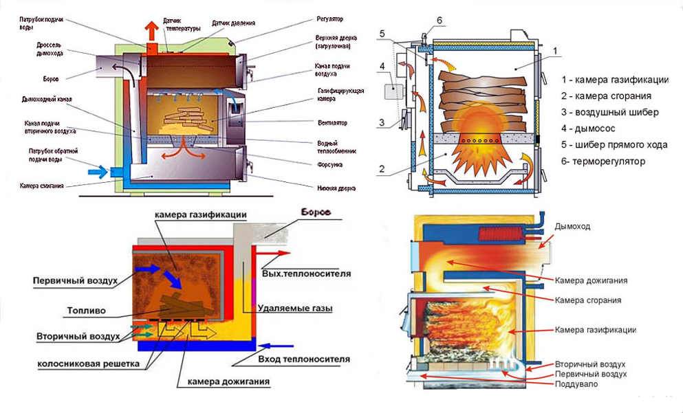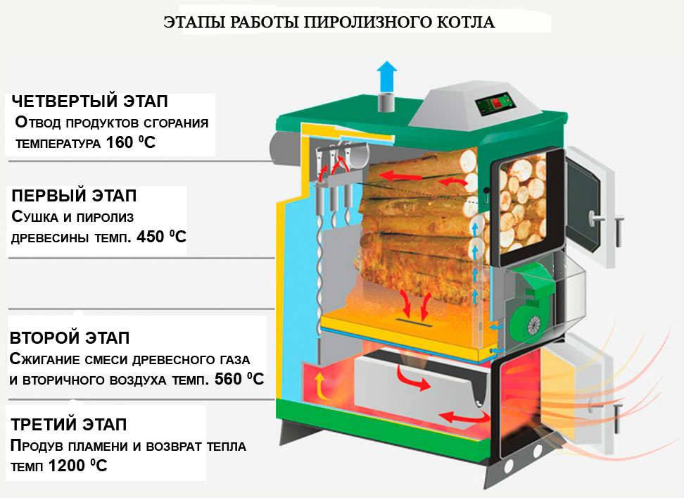 Рисунок хорошо иллюстрирует основные рабочие циклы пиролизного котла.