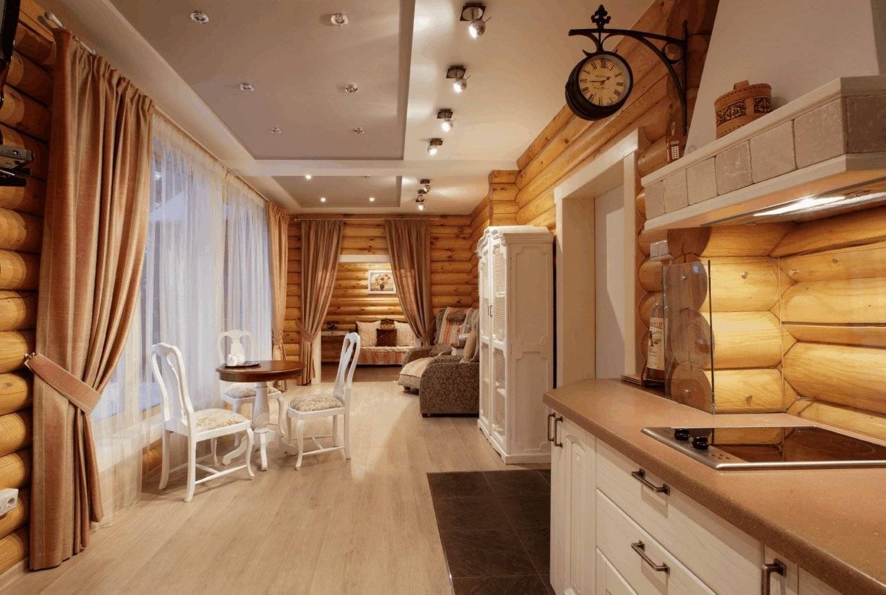 - Гостевые комнаты и предбанник высокой нагрузке не подвергаются. Для оформления комнаты применяют любые материалы. Однако сруб лучше не отделывать. Бревно – материал достаточно фактурный и привлекательный.