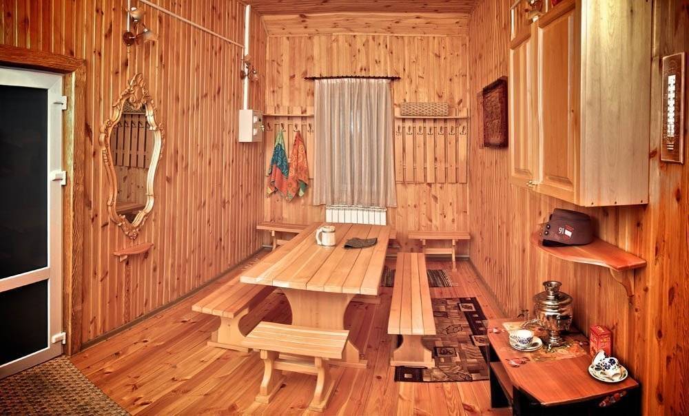 В комнате отдыха в обеденной зоне обязательно должен присутствовать деревянный стол, окруженный стульями, либо скамьями. При организации места для отдыха можно предусмотреть диван, мягкие кресла. На стенах следует расположить полки для хранения посуды и банных аксессуаров, при этом громоздкий закрытый шкаф лучше не использовать.