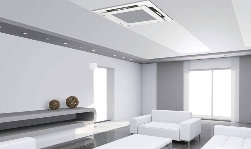 Конструкция кассетного аппарата обеспечивает высокое качество подачи воздуха в больших залах. Это двухблочный тип кондиционеров. Внутренний блок устанавливается на потолке, имеет квадратную форму и большую площадь воздуховодов. Через нижнюю панель подается воздух, а распределительные жалюзи регулируют напор. Чтобы установить такой кондиционер, необходим подвесной потолок, причём межпотолочное пространство должно быть 30–40 см.