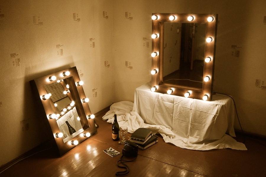 Для примера будет рассмотрен процесс изготовления наружной подсветки макияжного зеркала 50×70 см на деревянной раме из шестнадцати LED-ламп со стандартным цоколем Е27, рабочим напряжением 220 В. Будут использоваться лампы с матовыми колпаками, световым потоком 280 лм, потребляемой мощностью 3,5 Вт. Сборка потребует 16 керамических патронов, кабель, кнопочный выключатель, деревянный брусок, фанера, металлические уголки, саморезы, клей ПВА.