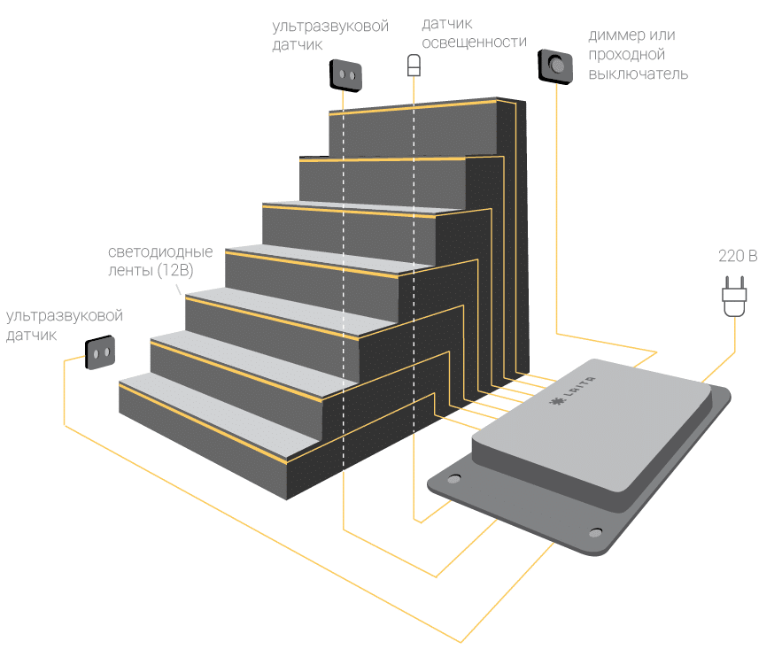 Более упрощенно схему проекта “подсветка лестницы на ступенях с датчиком движения” можно представить в таком варианте: