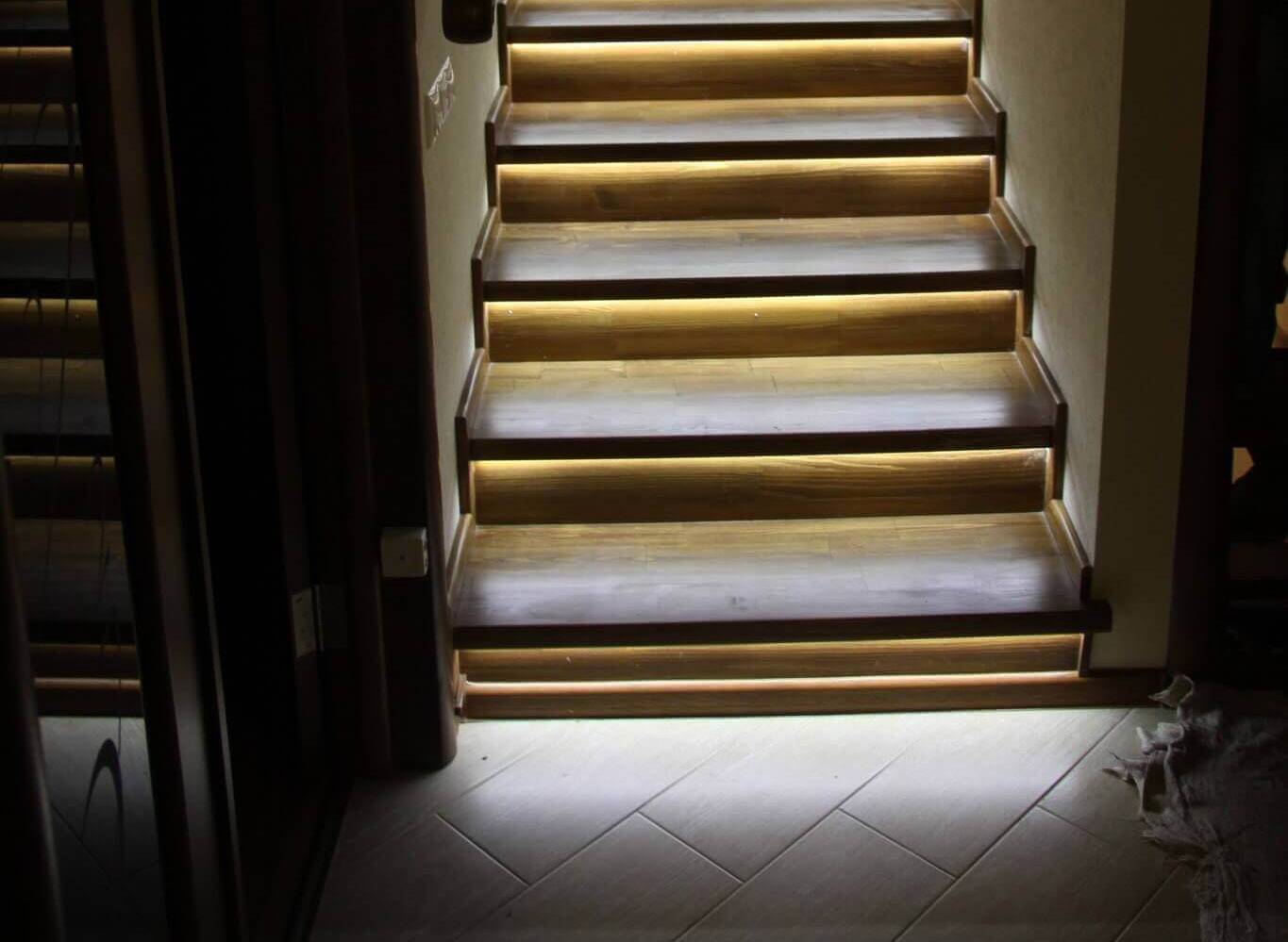 Делаем светодиодную подсветку ступеней лестницы Не знаете, как сделать подсветку лестницы светодиодной лентой? Для вас мы предоставили пошаговую инструкцию с фото, схемами и видео примерами монтажа!