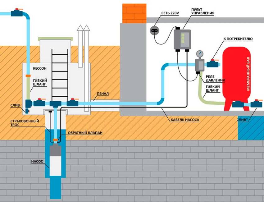 Автоматическая подача воды из скважины проводится при помощи мощного насоса.Он может быть: