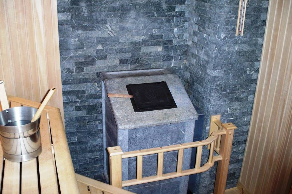- Могут сыграть свою роль и участки в парилке (на ее стенках или полу), облицованные керамической плиткой, кирпичом, камнем. Прогрев столь теплоемких поверхностей потребует дополнительной мощности печи.