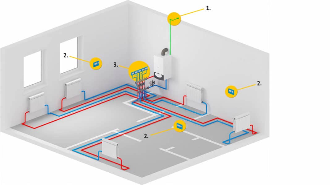 Главное отличие системы отопления — монтаж основной трубы к наиболее дальнему из радиаторов, от которого происходит ветвление к промежуточным батареям. После прохождения отопительной сети, теплоноситель возвращается в котел по обратному трубопроводу, обеспечивая равномерное распределение тепла по зданию.