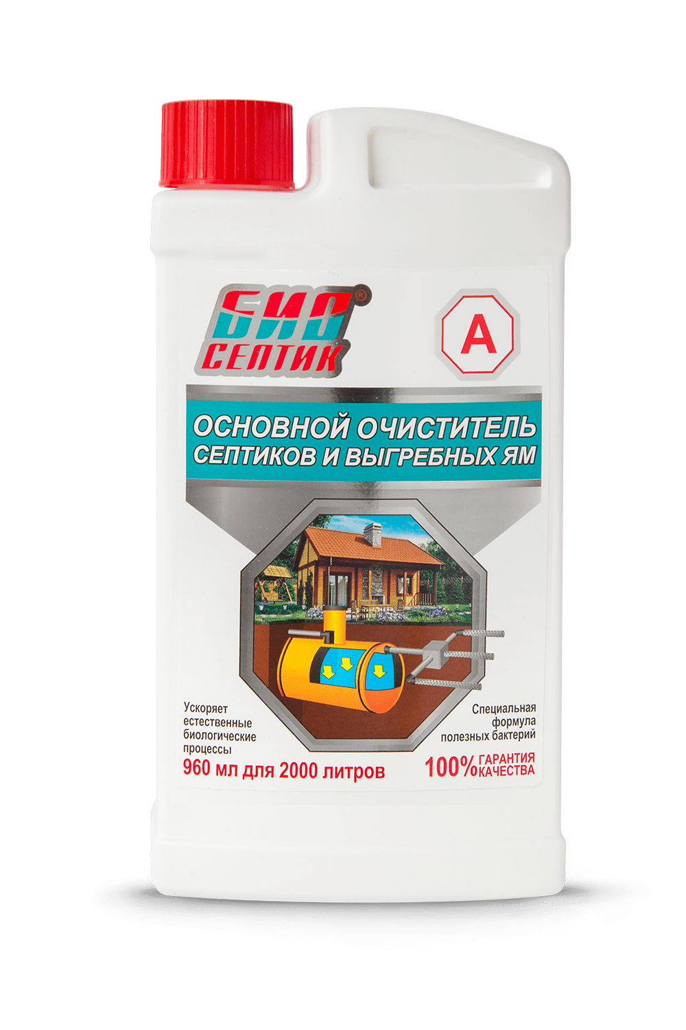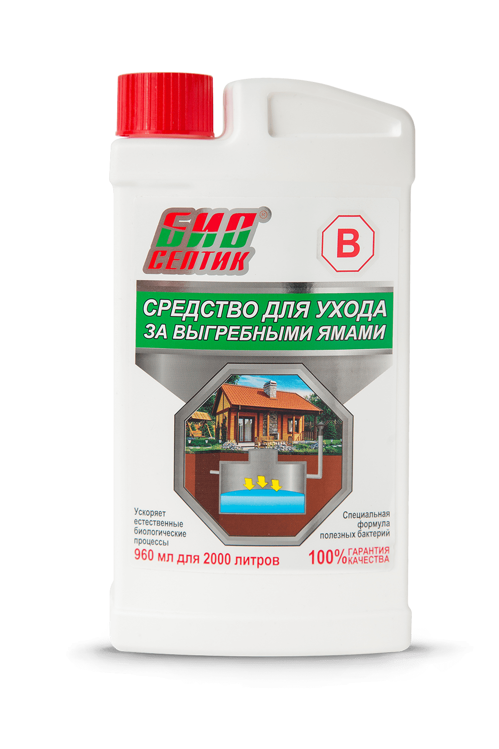Концентрированные жидкие смеси «Биосептик-А» и «Биосептик-В». Жидкость необходимо встряхнуть и вылить прямо в яму. В случае если выгребная яма подсоединена к дому, то жидкость рекомендуется выливать прямо в унитаз для очистки труб. Упаковки 960 мл хватает для резервуара емкостью 2000 л воды.