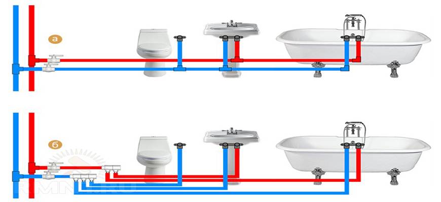 В схему входит коллектор (подключенный к стояку), от которого к каждому потребителю прокладывают отдельную ветку (как холодного, так и горячего снабжения).