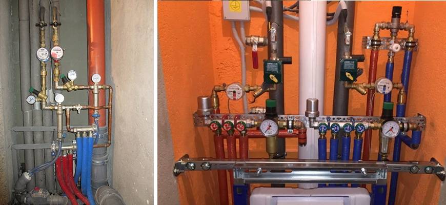 Комбинированную технологию применяют в помещениях с разветвленной планировкой (например, в многокомнатных квартирах или гостиницах). К стояку подключают коллектор для водоснабжения потребителей, от прибора ведут ответвления с тройниками для подачи жидкости к группе помещений.