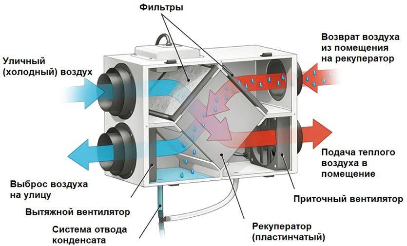 В рекуператорах воздух улицы подогревается выходящими из дома тёплыми потоками. Для циркуляции используются вентиляторы.