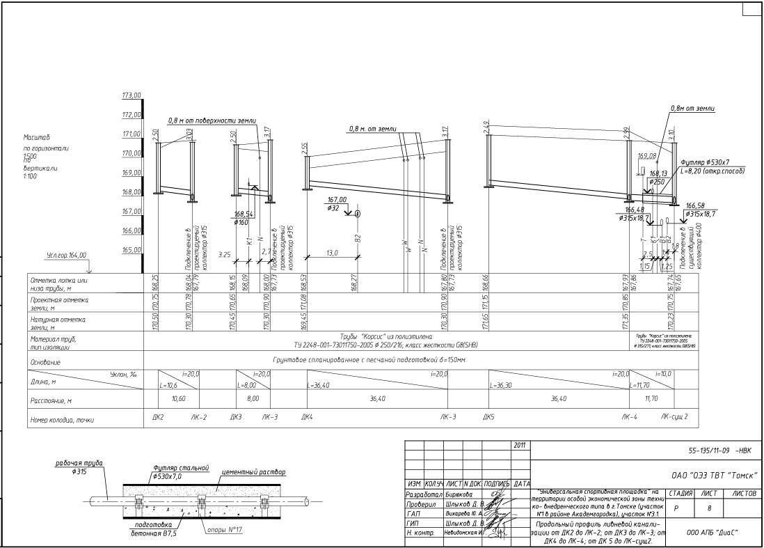 - В случае большой протяженности коллектора на план-чертеж необходимо нанести схему расположения ревизионных и поворотных колодцев.