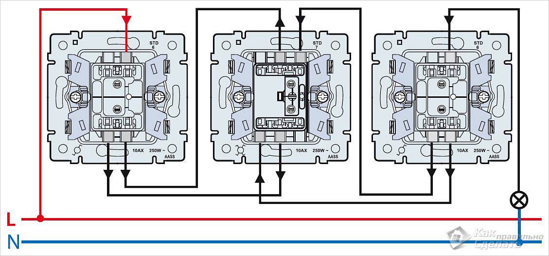 Как подключить проходной выключатель — схема управления светильником из 3 мест