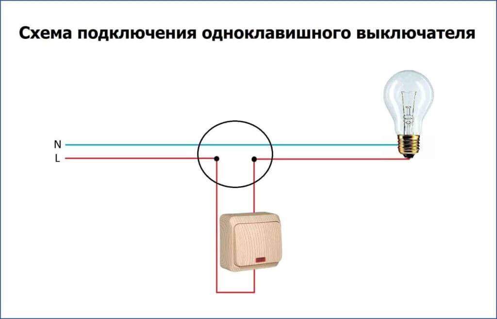 При подключении классического одноклавишного выключателя прокладывается один ноль и одна фаза. Рубильник устанавливается на линию фазы и размыкает и замыкает ее по мере необходимости.