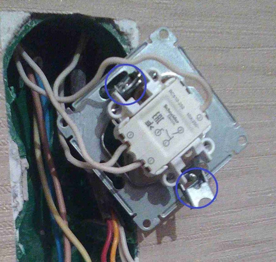 Для установки выключателя нужно выкрутить винтики из коробки, освободить отверстия для проводов. Для того, чтобы плотно закрепить коробку в стене, используют алебастр. Для «пустых» стен пользуются зажимающими скобами.