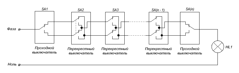 (используются в тех случаях, когда управление освещением должно осуществляться из трёх или более мест).