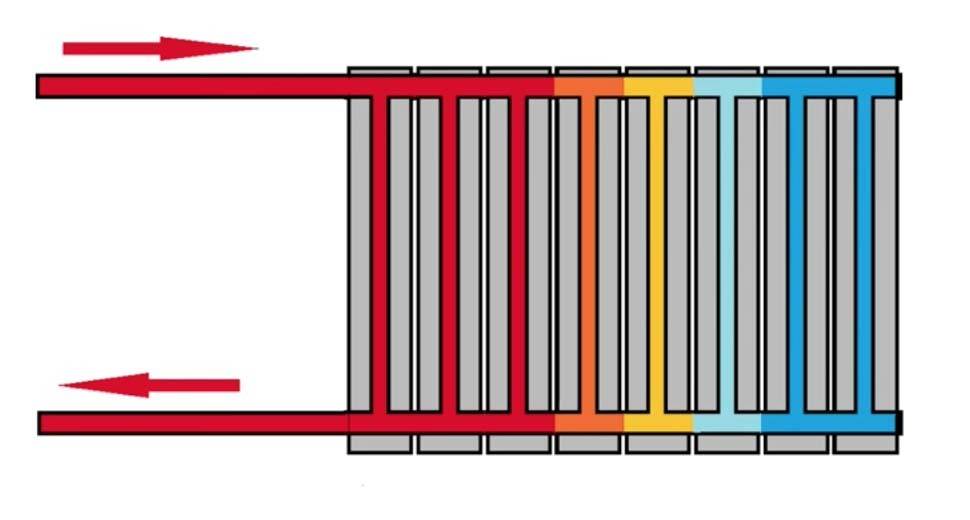 Увеличение количества секций (регистров) при боковом подключении приводит к уменьшению прогрева отдаленного противоположного участка, что приведет к существенному снижению теплоотдачи. Этот способ дает возможность добавлять ограниченное число дополнительных секций.