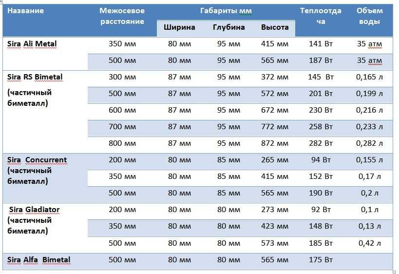 Есть еще медно-алюминиевый биметаллический панельный радиатор Sira 130. В нем трубы выполнены из меди, а на них крепятся множественные ребра из алюминия. Теплопроводность меди в два раза выше, чем у алюминия, и в шесть раз выше, чем у стали. Потому такие приборы имеют высокую теплоотдачу. Но это панельные биметаллические радиаторы, потому в таблице указана мощность всей батареи. Есть вариант с разным сечением труб: 1/2” и 3/4”, глубина радиаторов — 60мм, рабочее давление — 35 атм.
