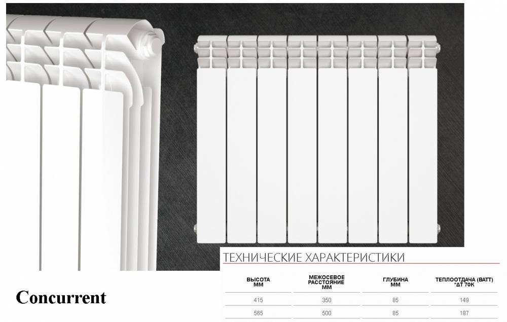 Биметаллические радиаторы Sira Concurent отличаются отсутствием сварных швов. Это позволило увеличить прочность оборудования и сделать его более устойчивым к разрывам – испытательное давление составляет 52,5 атм, рабочее давление – до 35 атм, давление на разрыв – 170 атм. Теплоотдача модельного ряда составляет 149 Вт/секцию при межосевом расстоянии 350 мм и 187 Вт/секцию при межосевом расстоянии 500 мм. На сегодняшний день это одни из самых выносливых устройств.