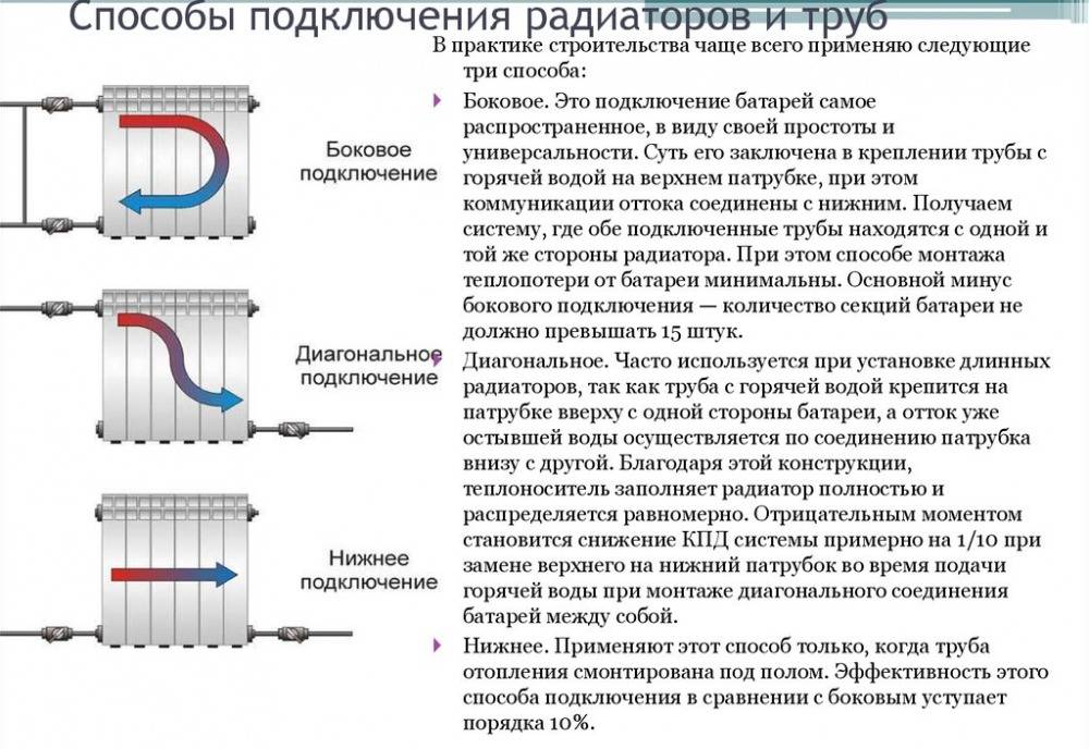 Другой способ подключения — диагональный, который применяется при установке радиаторов с большим числом секций. Он позволяет производить нагрев батареи по всему периметру. Подводящая труба присоединяется к верхнему патрубку радиатора, а отводящая крепится по диагонали от верхнего угла батареи к нижнему. Таким образом, подключение осуществляется с разных сторон.