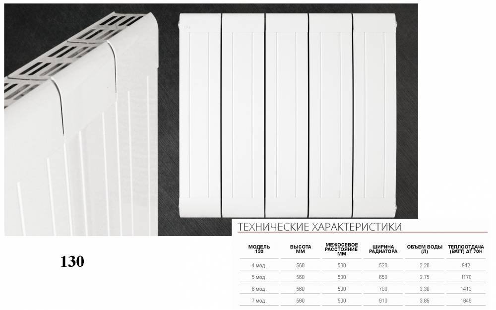 Серия биметаллических радиаторов с сердечником из меди и алюминиевой оболочкой. Имеют модульное строение: состоят из 4–7 секций, каждая по 13 см шириной. Глубина корпуса — всего 6 см. За счет использования меди, обладающей высокой теплопроводностью, серия 130 отличается эффективным теплообменом.