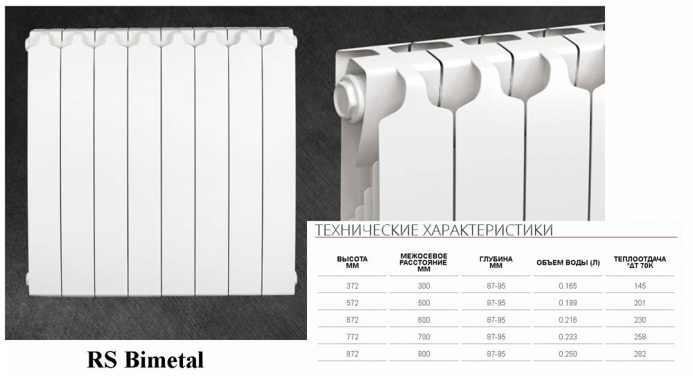 - RS-500 – межосевое расстояние 300 мм, объем – 199 мл, теплоотдача – 201 Вт;