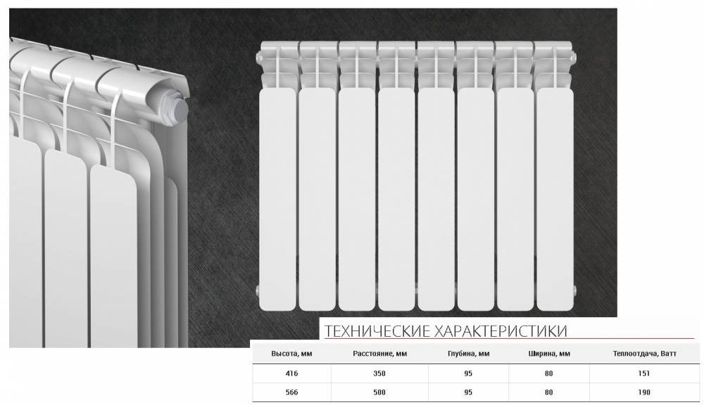 Самая важная техническая характеристика биметаллического радиатора — его теплоотдача. Количество тепла, которое радиатор отдает при температуре теплоносителя 70С, измеряется в Ваттах. Если говорить о среднем значении этого параметра, то оно обычно варьируется в пределах 170-190 Вт.