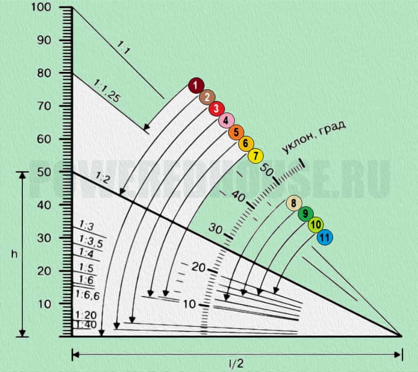 Следующая схема с указанием кровельных материалов наглядно показывает уклон крыши как в градусах, так и в отношении высоты к пролету:
