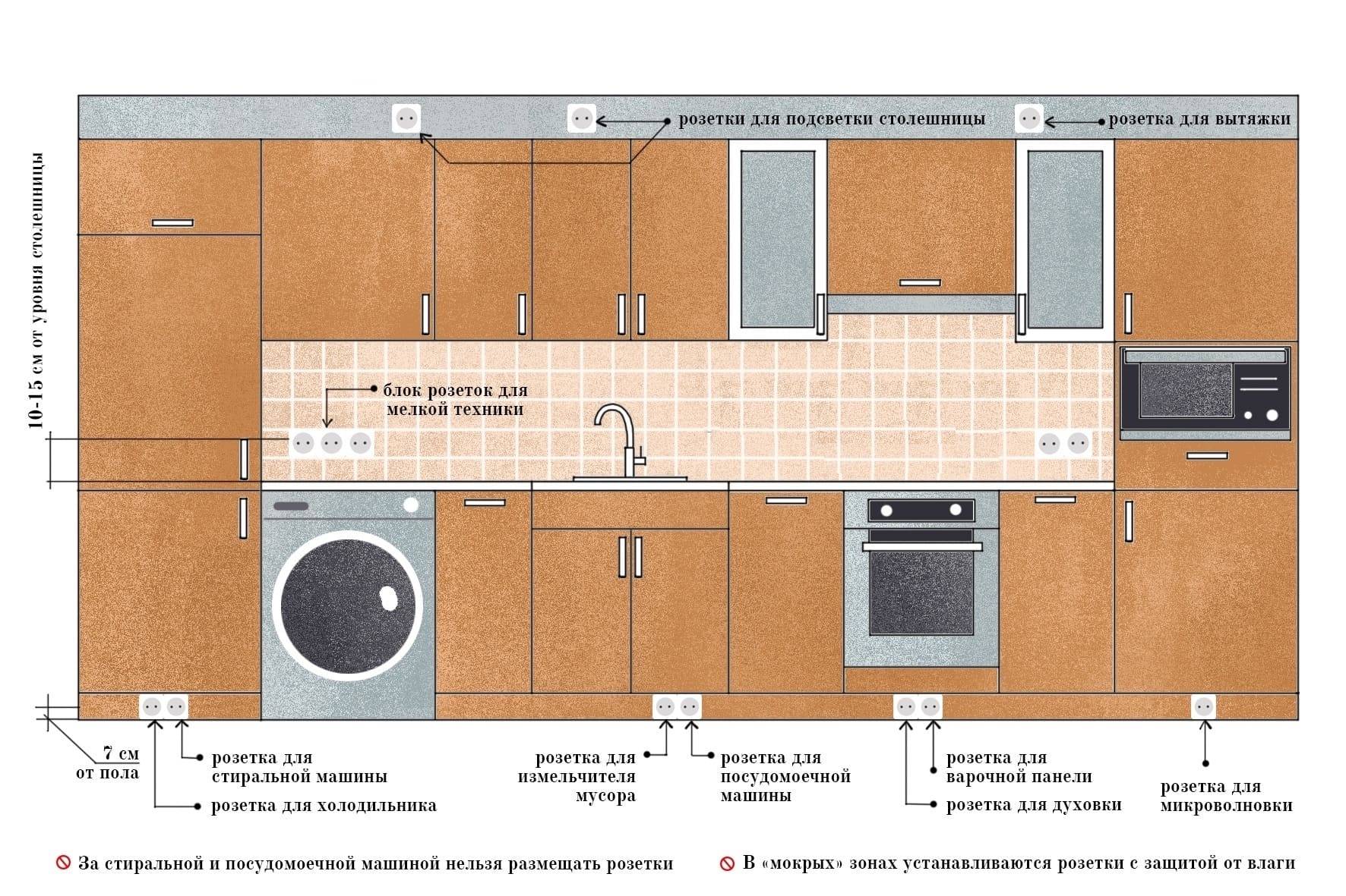 Для каждого бытового прибора в этом помещении должна быть своя розетка. И как минимум три из них нужно разместить над уровнем столешницы. Места подключения всех стационарных приборов могут быть скрытыми. А поскольку для холодильника категорически запрещено использовать удлинитель, то розетку для него размещают согласно длине шнура.