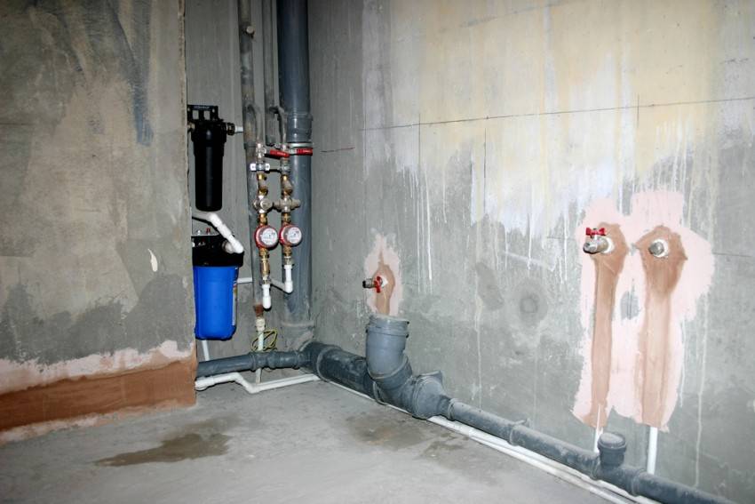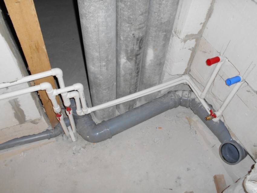 При совместной прокладке воды и канализации, последняя разводится снизу. При совместной прокладке труб холодной и горячей воды, горячая монтируется сверху.