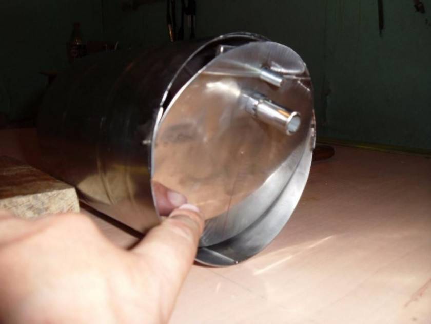 Своими руками стабилизатор изготавливают из трубы подходящего диаметра, материал – нержавеющая сталь марки AISI 304 или 321. Можно сварить трубу из листа нержавейки, понадобится аргоновая сварка. Толщина листа – 1 мм. Внутренний диаметр совпадает с диаметром дымохода. Длина – 250-300 мм. Швы необходимо тщательно зачистить. Для клапана выполняется вырез – примерно 15 % от сечения борова дымохода.