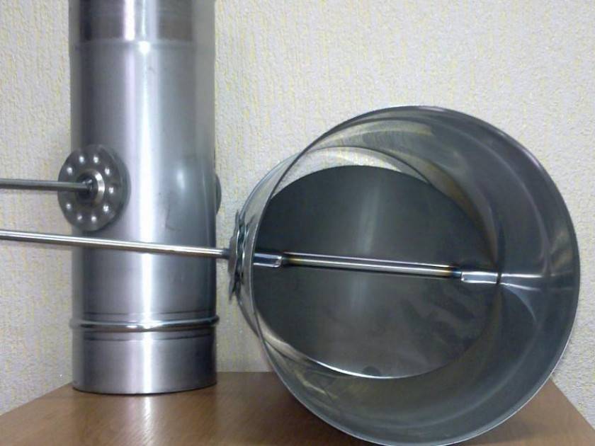Стабилизатор давления выполняет функцию клапана. Изготавливают его только из нержавеющей стали, он эксплуатируется при температурах до 500 °С и выше и используется на дымоходах отопительных агрегатов на любом виде топлива – от газовых котлов до угольных печей. Оцинкованную сталь для стабилизаторов не используют – они устанавливаются близко от котлов, подвергаются действию высоких температур, отчего оцинкованная сталь быстро прогорит.