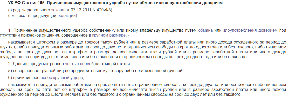 По ст. 165 УК РФ виновные граждане привлекаются к уголовному наказанию, если смогли сделать ущерб, сумма которого превысила 250000 рублей.