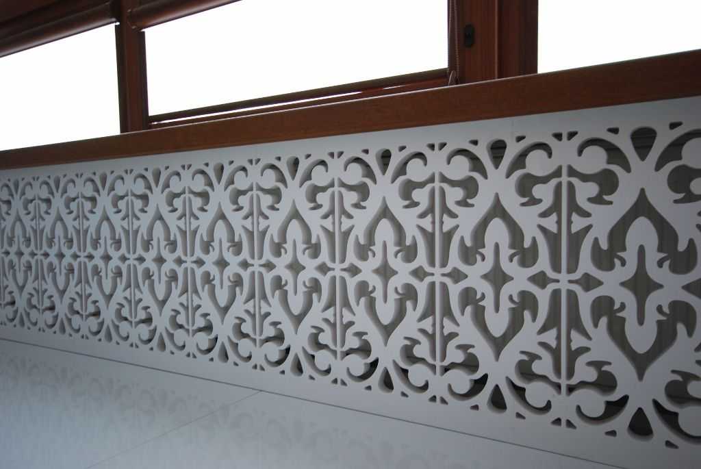 МДФ и ХДФ. Для изготовления используют ламинированные листовые материалы. Стазу стоит сказать, что при производстве МДФ и ХДФ не используются связующие вещества. Размягченные древесные волокна прессуются, в процессе выделяется лигнин — натуральное связующее, содержащееся в древесине. Лигнин и склеивает волокна. Так что оба эти материала абсолютно безопасны. Если изделия из МДФ мы более-менее хорошо знаем, то ХДФ для многих незнакомый материал. Отличается он от МДФ только условиями прессовки. Его формуют под более высоким давлением, в результате получается он совсем тонким (3-4 мм), но более плотным и однородным. ХДФ хорошо держит форму, потому ажурные решетки на радиаторы отопления часто делают именно из ХДФ. С точки зрения влияния на отопление они чуть лучше древесины — слой более тонкий, перфорации обычно больше.