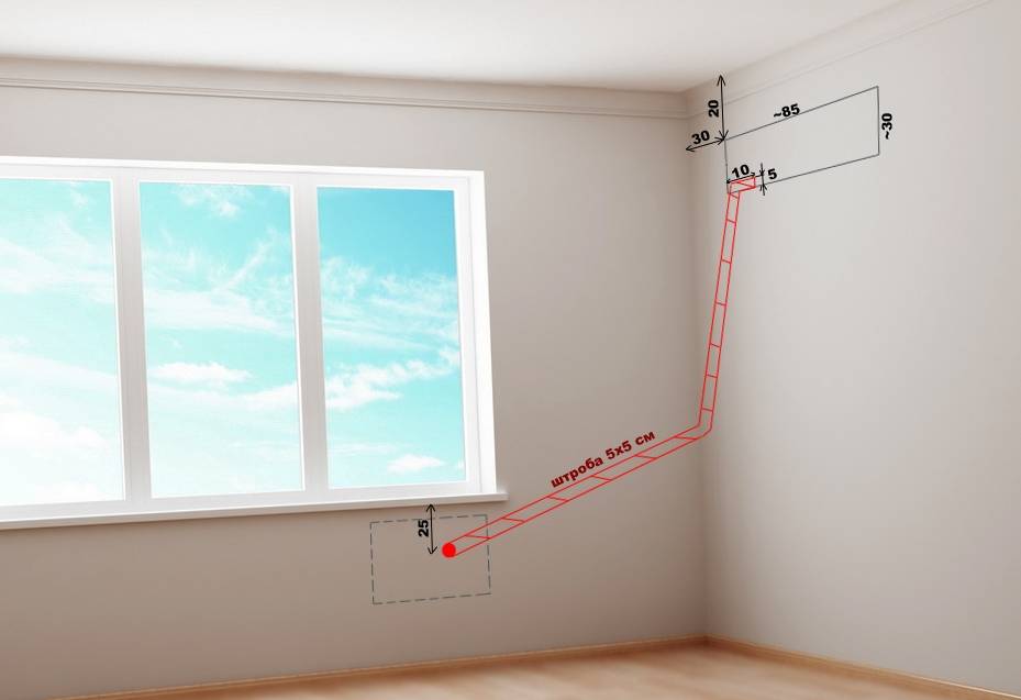 На основании проекта обустройства линий можно заблаговременно определить места вывода электрической сети, в т.ч. и для климатической техники. Если же нет возможности штробить стену, электропроводку можно проложить открытым способом.